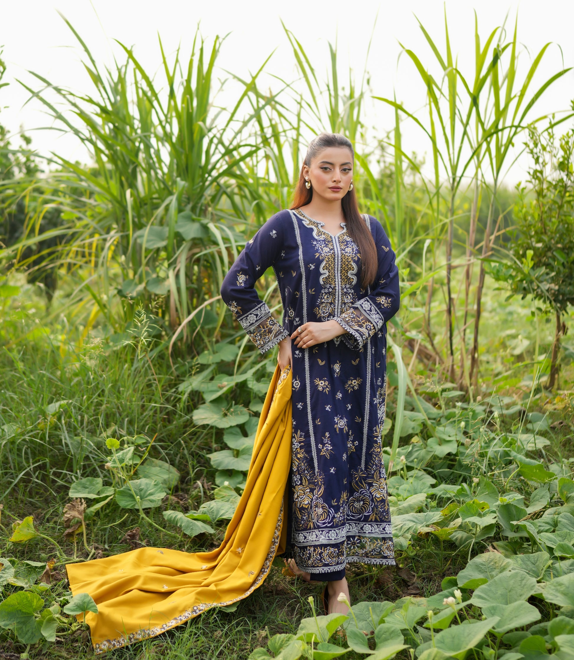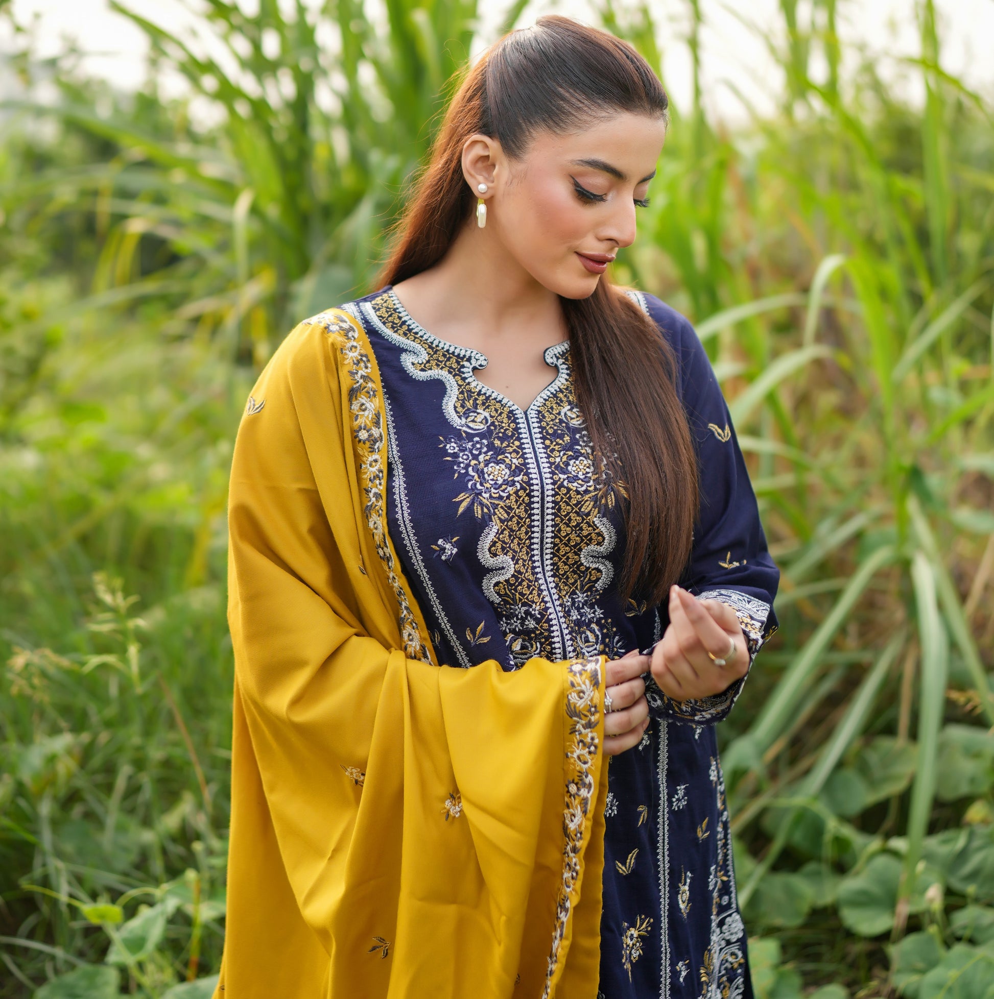 A navy blue shirt adorned with colour full embroidery work adds an ethnic touch to your wardrobe . Paired with solid pants and a mustardembroidered shawl, this ensemble is perfect to keep you warm and cozy.